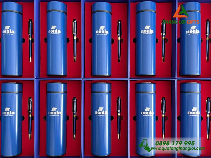 GST 90 – Bộ quà tặng (Bình Giữ Nhiệt + Bút Ký) Màu Xanh – In Khắc Logo NonLa Vietnamese Coffe